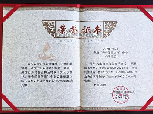 單位榮獲“山東省標識行業協會”會員單位,2020-2021年度“守合同,重信用”公示企業。